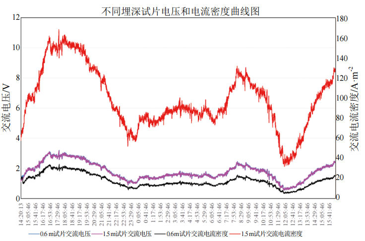 圖 5展示的是在同一位置、同一時(shí)段下,不同埋設深度的試片所測得的交流干擾數據。兩個(gè)試片的交流電壓基本一致,交流電流密度存在明顯差異,評估的交流干擾腐蝕風(fēng)險等級也不同。這種差異源于不同土壤電阻率,導致試片發(fā)散電阻顯著(zhù)不同。