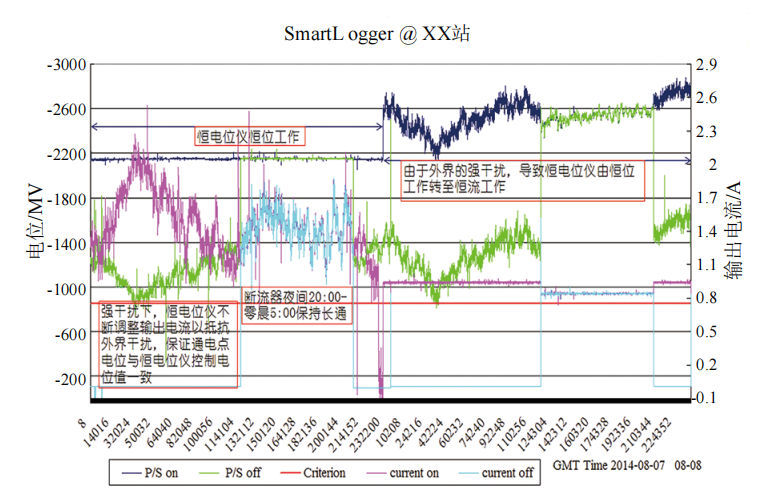 在直流雜散的檢測過(guò)程中,用CP-Thinker記錄儀記錄恒電位儀的輸出電流和通電點(diǎn)電位。