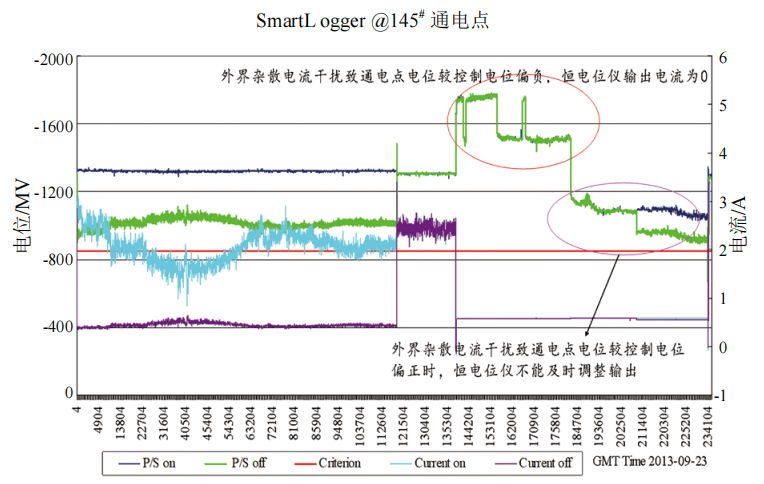 動(dòng)態(tài)直流雜散腐蝕風(fēng)險通常通過(guò)管道的腐蝕速率、管道極化電位正向偏移量及時(shí)間比例來(lái)評級,在極化電位的測試過(guò)程中,恒電位儀的性能及其在動(dòng)態(tài)直流雜散干擾下運行的穩定性,是影響檢測數據準確性的重要因素。