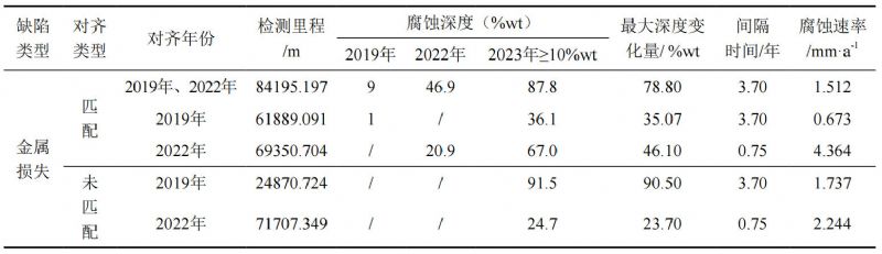 表 2 金屬損失最大深度變化量按對齊年份統計結果表