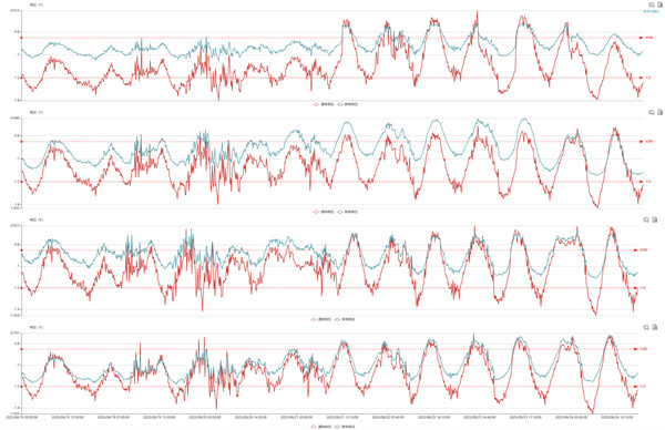 (1)智能電位測試樁可以實(shí)現對城市軌道交通動(dòng)態(tài)直流電流、地磁、潮汐、高壓直流接地極、交流輸電線(xiàn)路、交流電氣化鐵路等多種干擾類(lèi)型的有效監測。在部分地區,還會(huì )出現多種干擾類(lèi)型疊加的情況,如潮汐與地鐵、潮汐與地磁等的混合干擾,建議關(guān)注及監測。