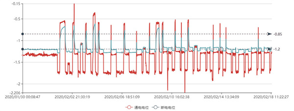 智能電位測試樁用于對管道的通電電位、斷電電位、交流電壓及交/直流電流密度等參數進(jìn)行高頻次監測并實(shí)現數據遠程傳輸和控制,與普通測試樁的核心區別在于功能維度的“自動(dòng)化、智能化” 升級,可自動(dòng)實(shí)時(shí)采集數據并自動(dòng)傳輸至云服務(wù)器,實(shí)現本地+云端雙存儲,實(shí)現智能預警+自動(dòng)報警功能,具有遠程監控功能。智能電位測試樁無(wú)需人員現場(chǎng)手工采集數據,彌補了無(wú)法實(shí)時(shí)采集數據的不足,在掌握現場(chǎng)實(shí)時(shí)測量數據后,便可根據電位(或電流等數據)的波動(dòng)情況分析出現場(chǎng)是否有雜散電流干擾,受到何種類(lèi)型的干擾,以便進(jìn)一步采取防控措施。