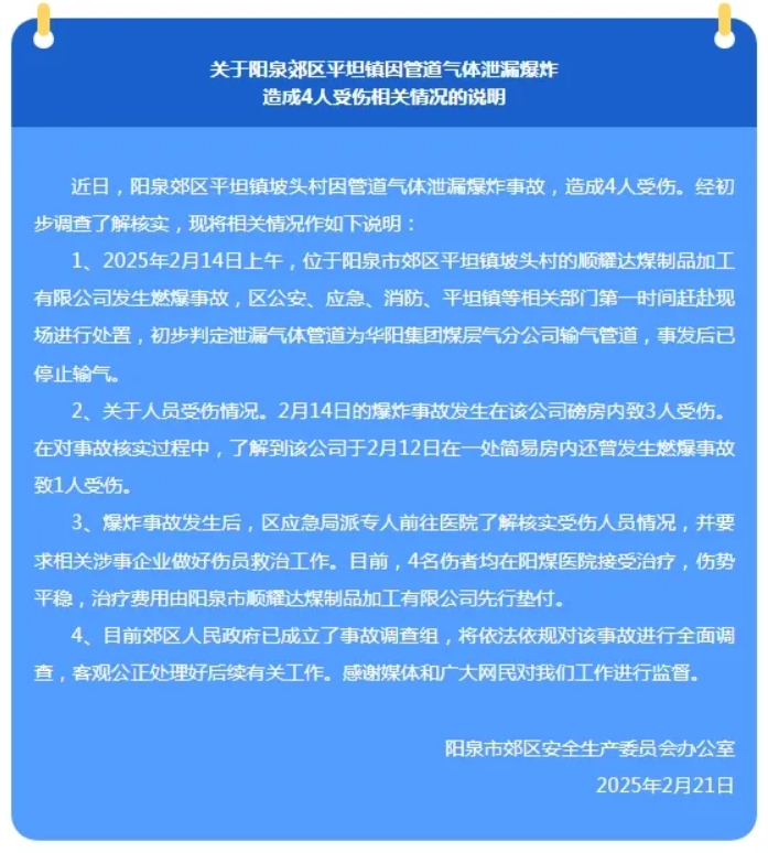 另?yè)A商報大風(fēng)新聞此前報道,2月19日山西網(wǎng)友發(fā)視頻稱(chēng),陽(yáng)泉市郊區平坦鎮坡頭村,因管道氣體泄漏爆炸事故,有4人受傷。2月21日,被炸傷的高先生表示,他在陽(yáng)泉市從事煤礦直銷(xiāo),在陽(yáng)泉市郊區平坦鎮坡頭村,因管道氣體泄漏先后兩次發(fā)生爆炸!罢率澹2月12日)上午10點(diǎn)50分發(fā)生過(guò)一次,正月十七(2月14日)上午10點(diǎn)多又發(fā)生一次!备呦壬f(shuō):“就在市郊區平坦鎮坡頭村坡頭煤業(yè)往北大約1000米處,那里敷設的他們的大管道漏了氣,它不是煤礦爆炸,是他們集團的煤氣層主管道泄漏氣體從地下竄到我們廠(chǎng)子里來(lái)了,是把我們礦床都炸了,就和井下瓦斯爆炸一樣!