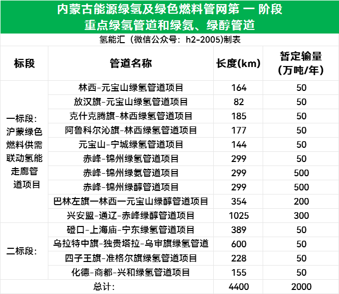 內蒙古能源綠氫及綠色燃料管網(wǎng)項目。2025年3月14日,中化商務(wù)電子招投標平臺發(fā)布《內蒙古能源綠氫及綠色燃料管網(wǎng)第一階段重點(diǎn)工程前期工作及可行性研究項目招標公告》,招標人為內蒙古能源集團子公司內蒙古蒙氫管網(wǎng)有限公司。本次招標總長(cháng)度達4400Km,共計14條管線(xiàn),包括10條綠氫管道、3條綠醇管道、1條綠氨管道。其中最長(cháng)的為興安盟-通遼-赤峰綠醇管道項目,長(cháng)度約1025km;最短的為敖漢旗-元寶山綠氫管道項目,長(cháng)度約82km。本次招標項目共劃分為2個(gè)標段。一標段為滬蒙綠色燃料供需聯(lián)動(dòng)氫能走廊管道項目;二標段包括:磴口-上海廟-寧東輸氫管道項目、烏拉特中旗-獨貴塔拉-烏審旗輸氫管道項目、四子王旗至準格爾旗輸氫管道項目和化德-商都-興和輸氫管道項目。