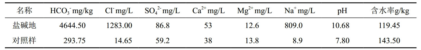 選用材質(zhì)為X65管線(xiàn)鋼,裸露面積為6.5 cm2的圓形試片, 其主要化學(xué)成分(質(zhì)量分數%)為: C 0.03,Si 0.17,Mn 1.51,P 0.024,Ni 0.17,Cu 0.04,Mo 0.16等。取某鹽堿地現場(chǎng)土壤樣品,以北京市昌平區非鹽堿地土壤為對照試樣,于實(shí)驗室進(jìn)行理化性能測試(表 1)。表明鹽堿地土樣的HCO3-、 Cl-、SO42-、pH明顯高于對照土樣;兩種土壤成分可以代表典型鹽堿地和非鹽堿地土壤條件。