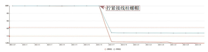 (2)接線(xiàn)松動(dòng)或虛接,F場(chǎng)發(fā)現接線(xiàn)板接線(xiàn)柱螺帽未擰緊,松動(dòng)約2~3圈,致使設備采集信號丟失或數據異常(圖 4)。還有管道連接線(xiàn)接線(xiàn)松動(dòng)(虛接),導致采集的通電電位、交流電壓信號異常(圖 5),無(wú)法真實(shí)反映管道陰保運行狀態(tài)。