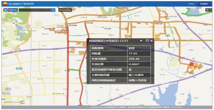 (3)風(fēng)險評價(jià)與隱患識別。主要采用半定量評價(jià)標準開(kāi)展風(fēng)險評價(jià),根據所選管段屬性和周邊環(huán)境情況,將管段劃分為不同單元,結合對應的風(fēng)險評價(jià)指標進(jìn)行打分,依據風(fēng)險評分計算模型得出各單元管段相對風(fēng)險值。通過(guò)在系統內建立風(fēng)險評價(jià)模型,實(shí)現逐條管線(xiàn)在線(xiàn)精準評價(jià)(圖 3),使以往操作復雜的風(fēng)險評價(jià)方法得以在線(xiàn)大量實(shí)踐應用,在系統內生成快捷、便利的自動(dòng)測評結果展示。評價(jià)完成后GIS地圖直觀(guān)生成全公司風(fēng)險展示圖(圖 4)。同時(shí)總結梳理管道典型隱患/失效類(lèi)型,制定隱患分級判定企業(yè)標準,推動(dòng)風(fēng)險隱患科學(xué)識別,并開(kāi)發(fā)系統模型實(shí)施線(xiàn)上評價(jià)。