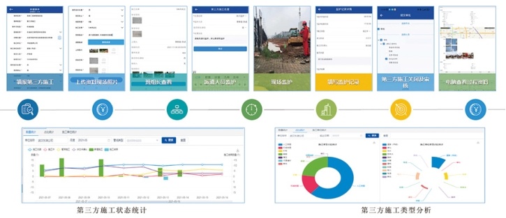 (6)維修與維護。針對可能造成嚴重后果的第三方損壞、地質(zhì)災害、腐蝕等風(fēng)險,采取多種手段實(shí)施管控(圖 5、圖 6),并在系統內實(shí)現全程監控。一是對高風(fēng)險管道閥井、周邊密閉空間、調壓箱(柜)等重點(diǎn)區域加裝無(wú)線(xiàn)可燃氣體泄漏監測及地災、水位、智能陰保和壓力監測設備,并接入系統監測。二是第三方施工監護實(shí)施分級管理,采用“人工監護+設置臨時(shí)視頻監控”,自發(fā)現施工事件至施工結束、現場(chǎng)驗收,通過(guò)系統實(shí)現閉環(huán)管理。三是對管道定檢、內外檢測發(fā)現的問(wèn)題形成系統數據,通過(guò)錄入管道缺陷信息、維修記錄,及時(shí)掌握管道缺陷變化情況,形成多輪檢測數據對齊。四是為預防各類(lèi)失效風(fēng)險編制現場(chǎng)處置預案,設置區域關(guān)閥分析、應急資源查詢(xún)等功能,開(kāi)展應急處置演練。