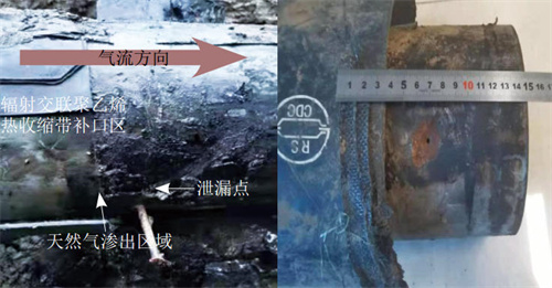 某公司天然氣支線(xiàn)管道2012年5月建成投產(chǎn),管徑168.3 mm,設計壓力6.3 MPa(生產(chǎn)運行壓力4 MPa)、管材為L(cháng)245(無(wú)縫管),設計壁厚5 mm,全長(cháng)10.6 km,管輸介質(zhì)為天然氣,管道干線(xiàn)防腐層為3PE。巡線(xiàn)人員雨后巡線(xiàn)發(fā)現該管道K3#+890 m上方積水處有氣泡,初步判斷為管道泄漏。經(jīng)開(kāi)挖發(fā)現該處彎管直管部分管體發(fā)生腐蝕穿孔泄漏,穿孔處外防腐層完好,天然氣通過(guò)聚丙烯冷纏帶與輻射交聯(lián)聚乙烯熱收縮帶搭接區處漏出。