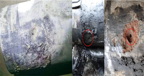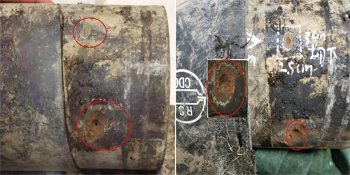 圖 2 泄漏點(diǎn)宏觀(guān)形貌(穿孔口徑為搶修插入木楔所形成)
