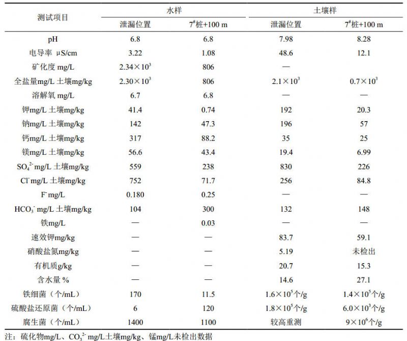 從表 1可以看出,2處位置土壤和水的pH均為近中性;泄漏位置的電導率、水中礦化度、土壤中全鹽量,氯離子含量均高于對比位置一個(gè)數量級左右;泄漏位置水和土壤中的鐵細菌含量和腐生菌含量均高于對比位置;泄漏位置土壤中硫酸鹽還原菌含量比對比位置高2個(gè)數量級。