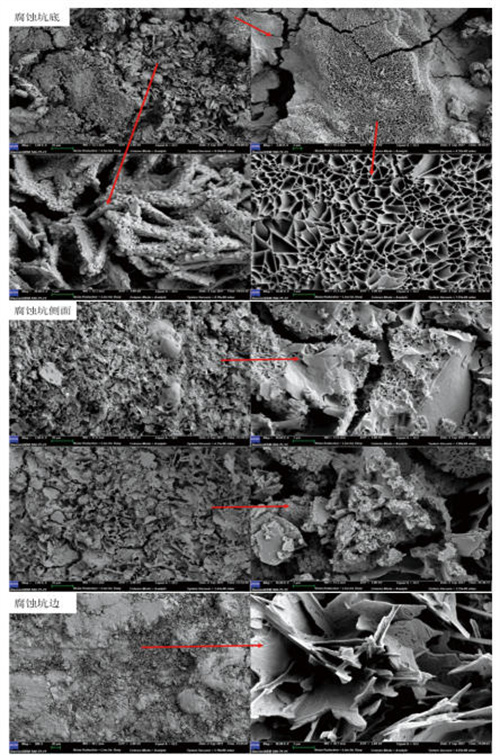 圖 5 腐蝕坑不同位置腐蝕產(chǎn)物的微觀(guān)形貌和能譜