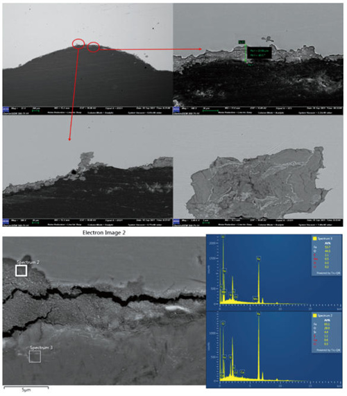 從腐蝕坑位置的截面形貌和能譜分析結果(圖 6)可以看出,由于表層腐蝕產(chǎn)物脫落,剩余的腐蝕產(chǎn)物厚度在20μm左右,腐蝕不均勻,局部位置存在小的點(diǎn)蝕坑。腐蝕產(chǎn)物與基體結合較差,部分位置脫離,腐蝕產(chǎn)物中含有大量的硫元素和氯元素,說(shuō)明有可能存在細菌腐蝕。