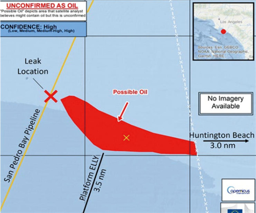 2021年10月1日,美國B(niǎo)eta Offshore公司所轄圣佩德羅灣海底管道發(fā)生一起原油泄漏事故,現場(chǎng)未造成起火爆炸和人員傷亡。泄漏原油約588桶,造成從亨廷頓海灘到墨西哥北部海灘的環(huán)境污染,浮油帶面積約33 km2,距離岸邊7.5 km,總經(jīng)濟損失(含清理費用)約1.6億美元,泄漏處進(jìn)行換管后于2023年4月重新啟輸。