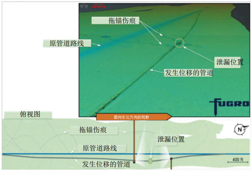 10月22日,管道企業(yè)完成了水下調查,結果顯示有1230 m管道發(fā)生偏移(圖 3),最大偏移距離32 m,在臨近管道泄漏位置處有刮痕/沖刷的跡象,管道混凝土配重層有明顯的凹陷變形。