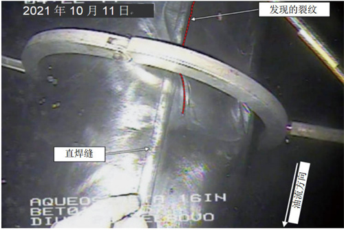 對泄漏位置的管段進(jìn)行超聲和磁粉檢測發(fā)現,管道直焊縫的下方表面存在長(cháng)度為551.7 mm的軸向裂紋,順油流方向10:30~11:00的位置(圖 4)。為防止裂紋進(jìn)一步擴展,在裂紋兩端各鉆了一個(gè)10 mm的止裂孔,采用環(huán)氧樹(shù)脂和復合包裹材料(SynthoGlass® A+ Wrap™)進(jìn)行臨時(shí)堵漏。