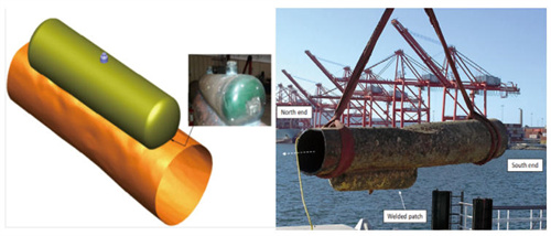 11月20日,再次檢查時(shí)發(fā)現堵漏處出現了滲漏,考慮近30 m的水深和管道變形情況,管道企業(yè)設計并制作了一種修復裝置,將一段直徑254 mm的管段以修復補丁的方式焊接到失效位置(圖 5),其材料和厚度與受損管道相同。修復補丁帶有焊接的端蓋以及用于排氣、密封的螺紋配件,底部覆蓋整個(gè)裂紋,從大約9:00延伸到12:00方向的位置,采用水下焊接,防止換管前進(jìn)一步泄漏。后續在完成一系列的清管和清洗作業(yè)后,于2022年10月26日完成了對破裂點(diǎn)上下游共6段管道的切割并打撈至水面。