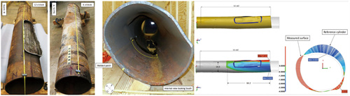 宏觀(guān)檢查受損管段發(fā)現明顯管體變形,順油流方向在6:00和12:00方向出現壓扁和局部凹陷,在3:00和9:00方向出現膨脹、拉伸,管道混凝土保護層出現損壞,管段從南向北端沿軸向彎曲,向外彎曲至3:00側。為了更直觀(guān)的了解變形損壞情況,采用3D掃描對管道表面輪廓進(jìn)行建模(圖 6),共計觀(guān)察到3個(gè)變形特征,其中變形深度76.2 mm~12.7 mm、長(cháng)度1630 mm~718 mm、寬度363 mm~129 mm。