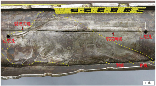 裂紋沿直焊縫焊趾處由南向北延伸,其中外表面長(cháng)度457 mm、內表面長(cháng)度289 mm,呈“T”字形,外表面裂紋南側起始端位于止裂孔以北38.1 mm,北側末端距焊趾20 mm。裂紋由外表面向內表面擴展,最大裂紋開(kāi)口尺寸2.54 mm,由中心向兩端逐漸閉合,裂紋下方觀(guān)察到3個(gè)明顯的劃痕(圖 7),與管道軸線(xiàn)成約25度角。